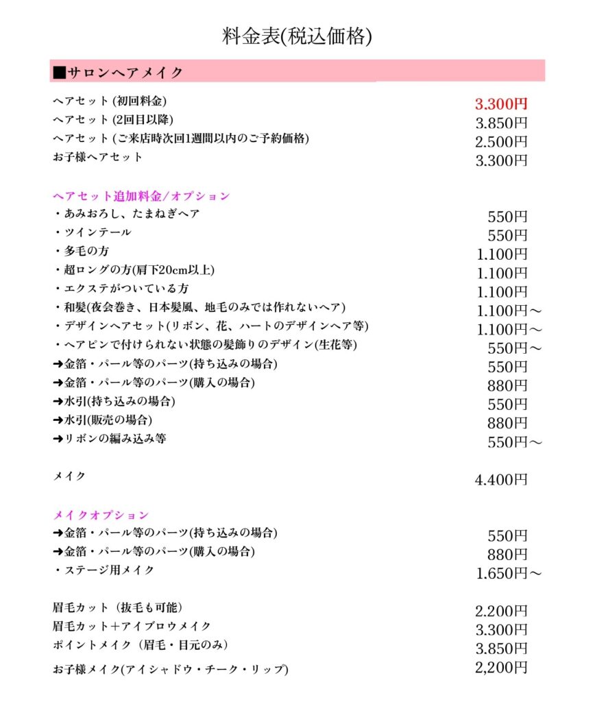 *ヘアセットとメイクをさせて頂きますので、ノーメイクでお越しください。