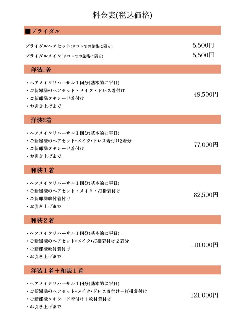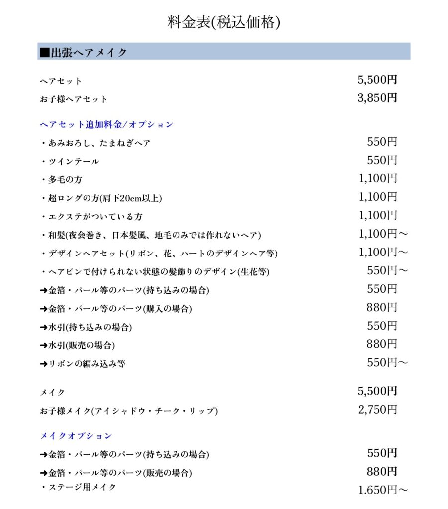 サロン・出張・ブライダルヘアメイクの料金一覧となっております。