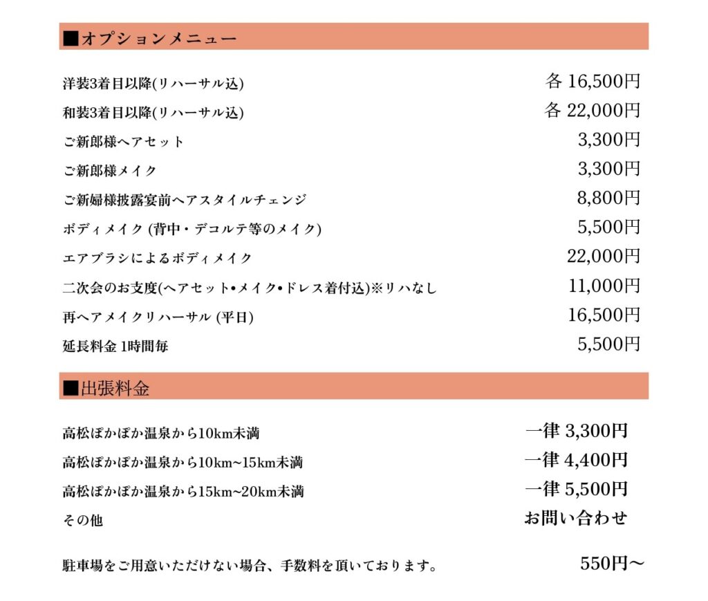 結婚式場に持込ヘアメイクとして出張する場合の料金です。